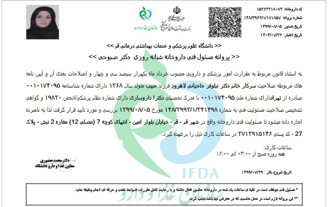 خانم دکتر نیلوفر حاجیانی(دکتر داروساز) دارای پروانه مسئولیت فنی داروخانه دکتر صبوحی از ساعت ٤ تا ١٦ به شماره ١٤٨/٣٩٦٢/١/١٧١٨٥٧ به تاریخ صدور ١٣۹۹/۰۸/۰٥