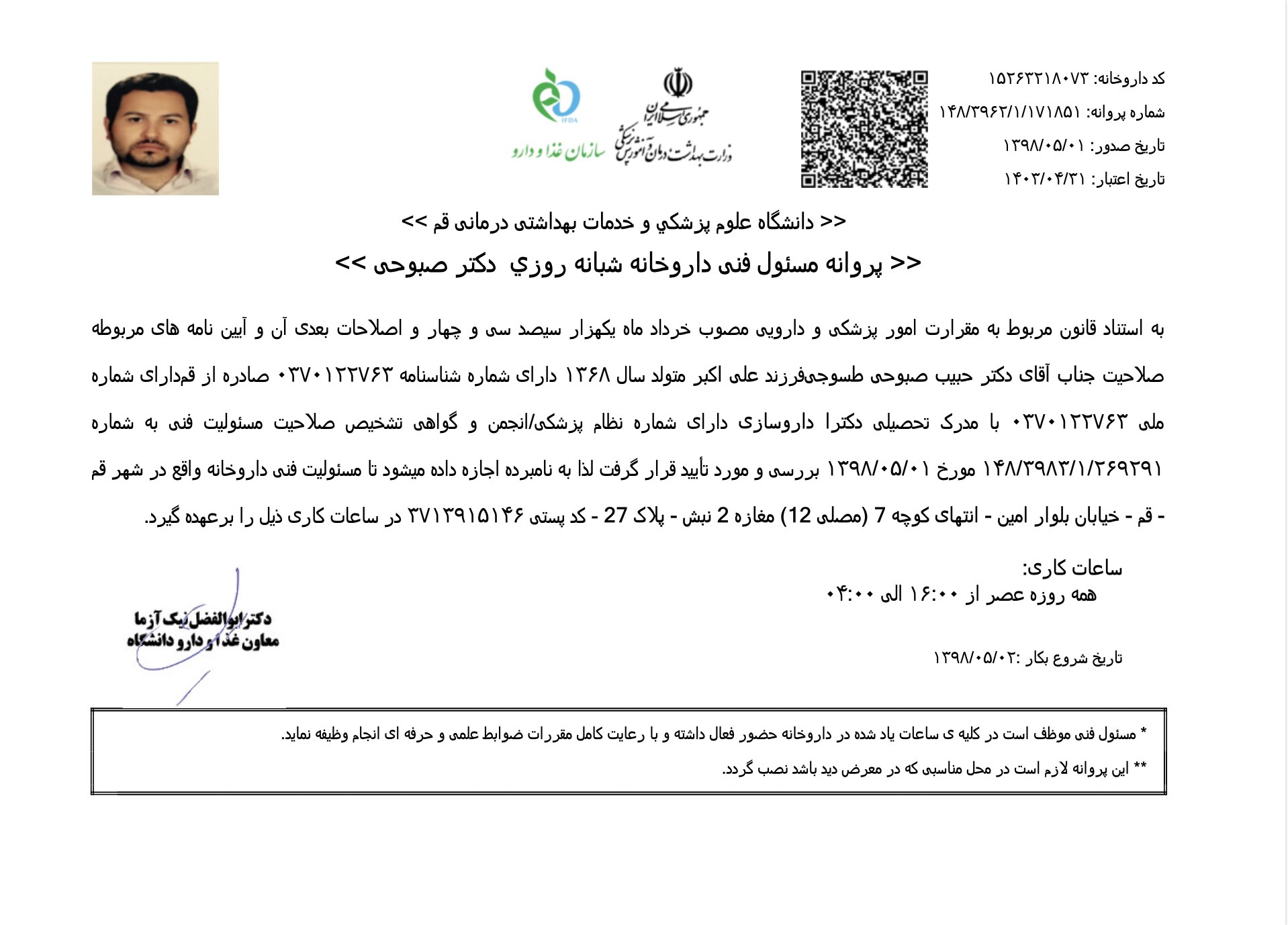 آقای دکتر حبیب صبوحی ( دکتر داروساز ) دارای پروانه مسئول فنی داروخانه دکتر صبوحی به شماره ١٤٨/٣٩٦٢/١/١٧١٨٥١ به تاریخ صدور ١٣۹۸/۰۵/۰۱ از ساعت ١٦ الی ٤