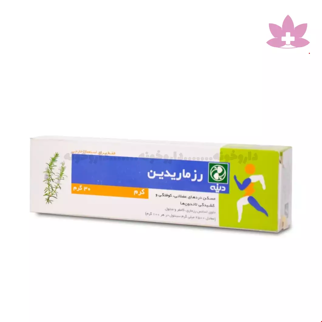 کرم رزماریدین دینه فرآورده ای گیاهی است که حاوی اسانس رزماری، کامفر و منتول می باشد. کرم رزماریدین دینه با افزایش گردش خون موضعی و تسکین درد مناسب مصرف افراد مبتلا به دردهای روماتیسمی و همچنین دردهای عضلانی و مفاصل، کشیدگی تاندون ها و دررفتگی (به خصوص در ورزشکاران) می باشد.